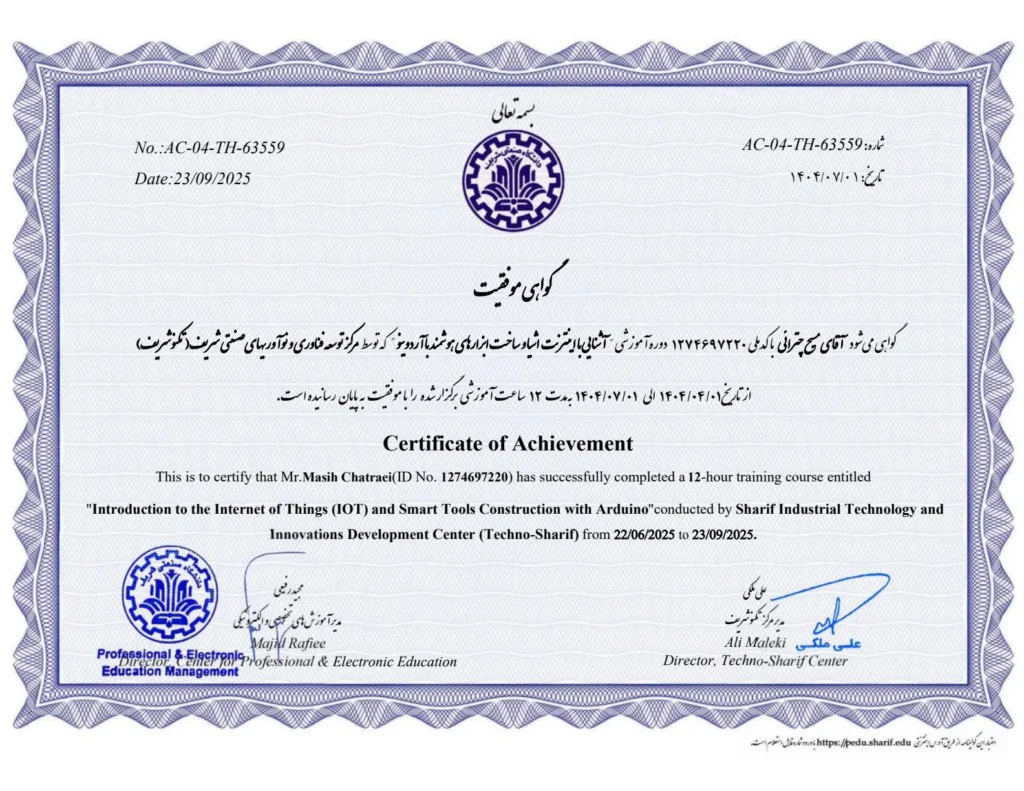 This summer, I enrolled in an intensive training course titled “Introduction to the Internet of Things and Building Smart Devices with Arduino,” offered by TechnoSharif Academy (affiliated with Sharif University of Technology). This course served as a practical starting point for me to transform the concepts I had always studied theoretically into physical reality.