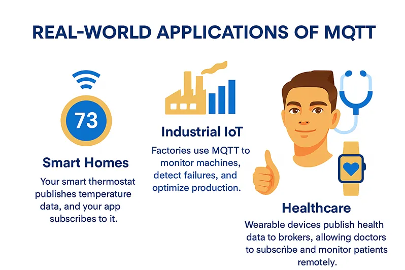 Factories use MQTT to monitor machines, detect failures, and optimize production.